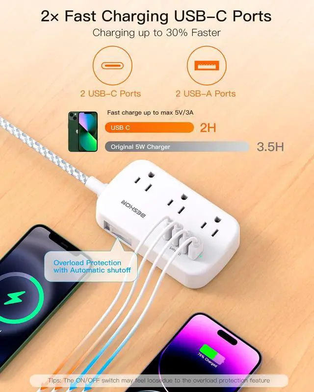Upgraded BESHON Power Strip added more USB-C ports to meet more charging demand. USB-C port can up to 15W/5V/3A max which is up to 30% faster than other chargers.