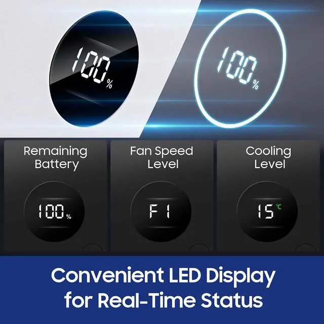 On-device controls let you easily adjust fan speed, cooling level, and check the battery status.