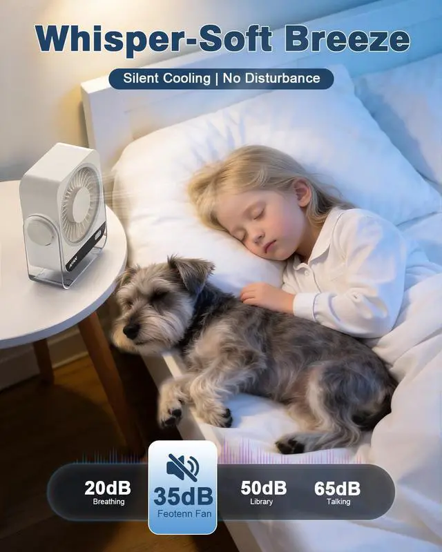 Library Quiet 35dB Operation: Experience true peace and quiet with our upgraded silent motor. At a mere 35dB, this desk fan provides powerful cooling for deep sleep, focused work, or studywithout a single distracting hum. Its the perfect bedroom fan and office fan for any space where quiet matters