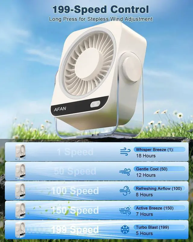 199 Speed Smart Control with LED Display: This portable table fan features 5 quick-switch presets for instant comfort. For finer control, press and hold to glide through 199 precise speeds and tailor your perfect airflow. The bright LED display keeps speed and battery always in view