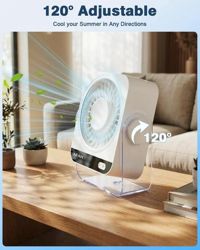 120° Adjustable Head for Targeted Cooling: This small table fan lets you aim airflow exactly where needed with its 120° adjustable tilt. Ideal for your office desk, bedside, or tent, it delivers spot-on personalized cooling. Set your angle once and enjoy efficient, hands-free comfort