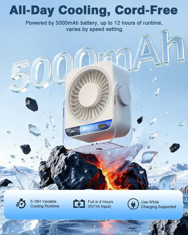 18-Hour Runtime & True Cordless Freedom: Enjoy up to 18 hours of true cord-free cooling from the 5000mAh battery. With dual power options, use it as a plug-in USB fan or a battery operated fan it even works while charging. Your reliable partner for travel, camping, or power outages