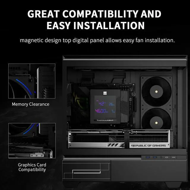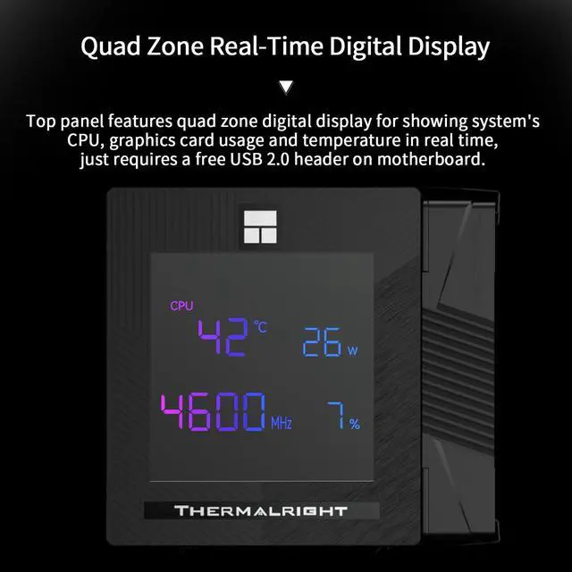[160mm height] The overall height of the cpu cooler is 160mm, making it compatible with mainstream ATX cases. The cooling tower features a pure black coating spray style and a digital display panel design with a magnetic top cover, combining the high cooling performance of the radiator with innovative technology.