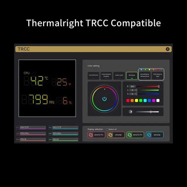 [ARGB Magnetic Display Panel] The magnetic top cover ARGB display panel, paired with the radiator, can monitor the temperature and utilization rate information of the CPU and graphics card. Combined with the TRCC control software, it enables monitoring of computer data