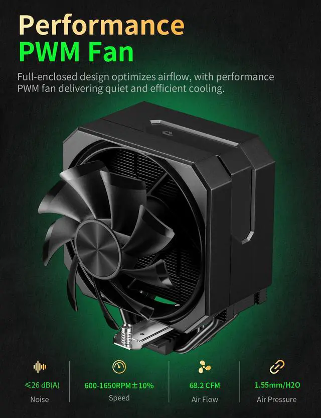 up1 Series CPU cooler features a full-enclosed design, performance PWM fans with adjustable speed, and perfect airflow, delivering 68.2CFM airflow and 600-1650RPM speed range, ensuring quiet operation (=25dB(A)) and efficient cooling for stable and extended system lifespan.