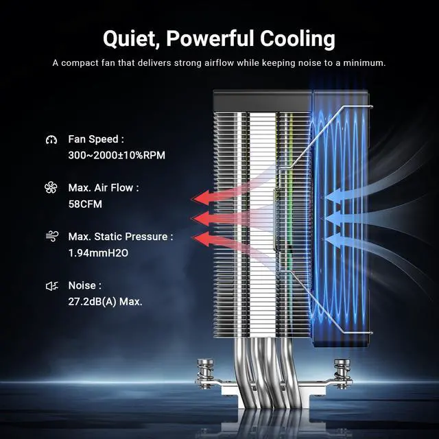 Enhanced Cooling with Fan UpgradeThe newly upgraded fan delivers higher static pressure, allowing it to push air more effectively through the dense fins of the tower heatsink for efficient heat dissipation.
