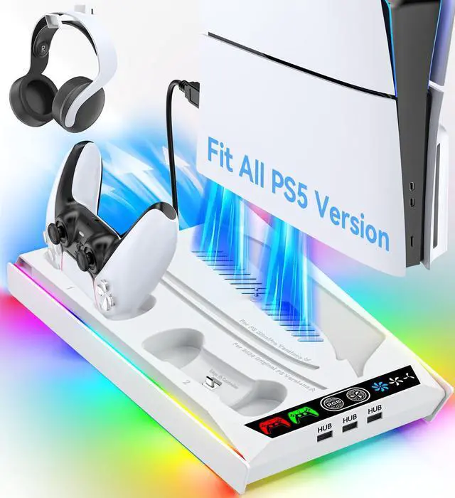 PS5/Slim/Pro Cooling Station with Quiet Cooling Fan and Fast Controller Charger for Disc & Digital Console, PS5 Accessories Incl. 3 USB Ports, Screw and Headset