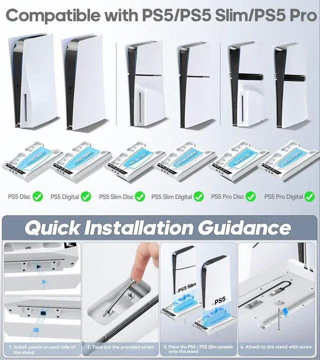 [Fit PS5/Slim/Pro Console] The ps5 cooling station is carefully crafted to fit PS5/Slim/Pro (Disc & Digital versions) perfectly. Screws are provided to firmly attach the console, protecting it from scratches and keeping it stable on the ps5 vertical stand.