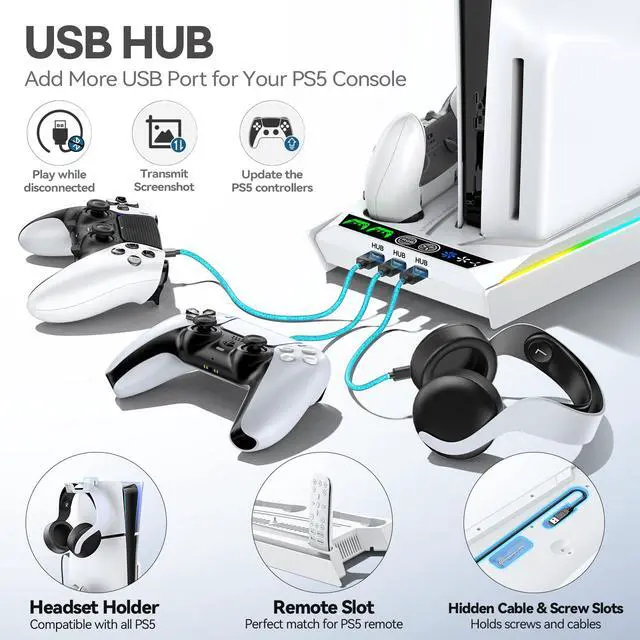 [Multiple Power Options] The bottom of the ps5 stand has a built - in cable that works with various power sources such as USB HUBs. A smart chip stops charging the PS5 controller at 80% to prevent overcharging, overheating, overcurrent, and voltage problems, thus ensuring the long life of the ps5 cooling station disc edition.