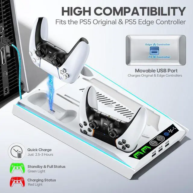 [For PS5/PS5 Edge Controllers] The ps5 cooling stand is completely compatible with the original PS5 controller and the PS5 Edge controller. It doesn't work with third - party PS5 controllers. When charging, the LED is red and turns green when fully charged or in standby, making it a great addition to any cooling station for ps5 console.