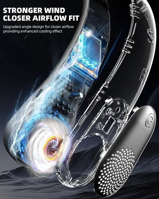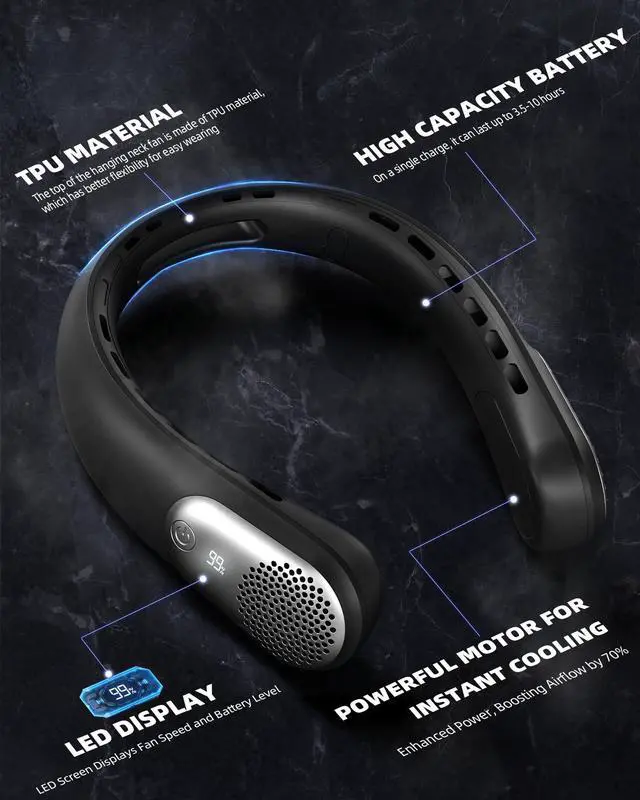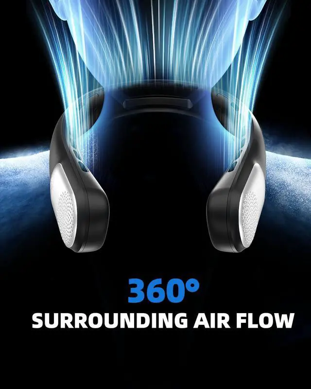 ADJUSTABLE AND SAFE MATERIALS: Neck fan that blow cold air feature a flexible TPU neckband that adjusts up to 150° for a comfortable fit. The rest of the fan is constructed with high-quality ABS material, ensuring safety, durability, and eco-friendliness for long-term use