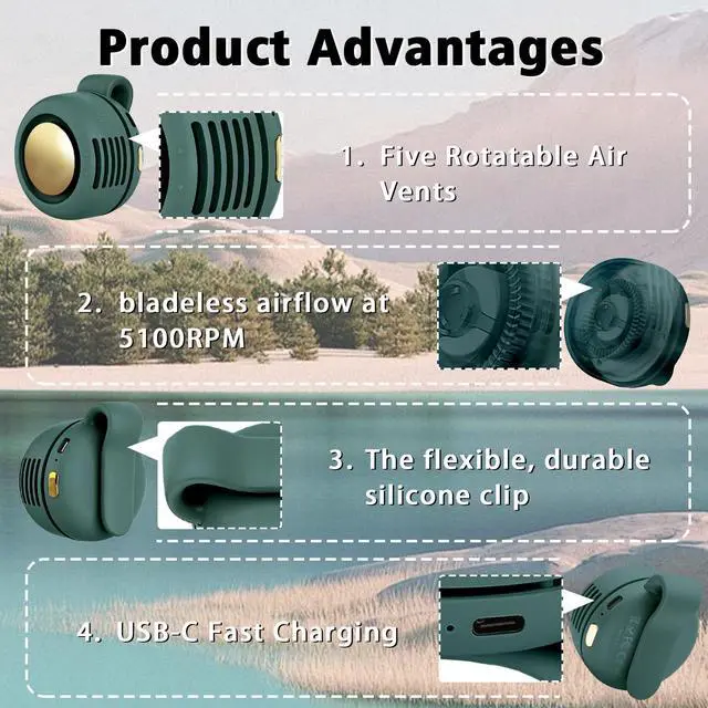 Strong Quiet,Ultra-SafeEquipped with a bladeless wind machine, greatly reducing the noise of the bladeless fan. Controlled under 25db when running, the small cooling fan is enough to hear its own breathing. Bladeless design, don't worry about hair curling in when using.