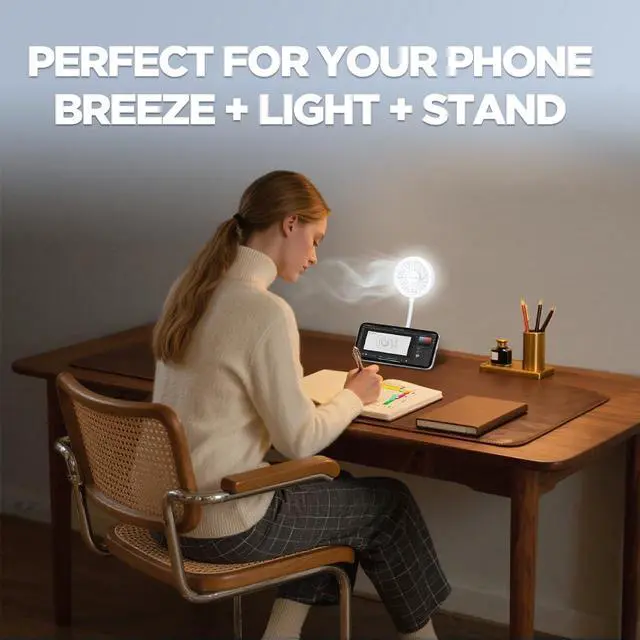 Yes! The flexible neck allows for precise multi-angle adjustments of airflow and light. Its built-in kickstand also lets you prop it up as a stable desk fan or phone stand at the perfect viewing angle.