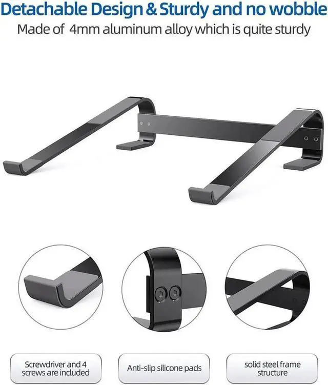 Description: Aluminum Alloy Sturdy and Stable Laptop Stand - Say Good-bye to Neck Pains. RAINBEAN computer stand could enables you to use the laptop in the most healthy and comfortable posture to prevent your sedentary cervical spine, spinal injury. Wide Compatibility All Laptop The laptop holder fits a variety of laptops from 10-18inches, such as MacBook 12/13, MacBook Air 13, MacBook Pro 13/15/2020/2019/2018/2017/2016, XPS, HP, ASUS, and other notebooks PC computers. Heat Dissipation Function With the Metal heat conduction alloy and ventilation hollow design, this computer riser offers the best ventilation and airflow needed to cool either your notebook or gaming laptop and preventing it from overheating. Easy to Use and Carry This laptop stand is easy to reassemble and fits perfectly without any issues. you could assemble it very easily it 3 steps. With our detachable design you can carry it anywhere, whether it is home office or business trip, it is very convenient and practical.