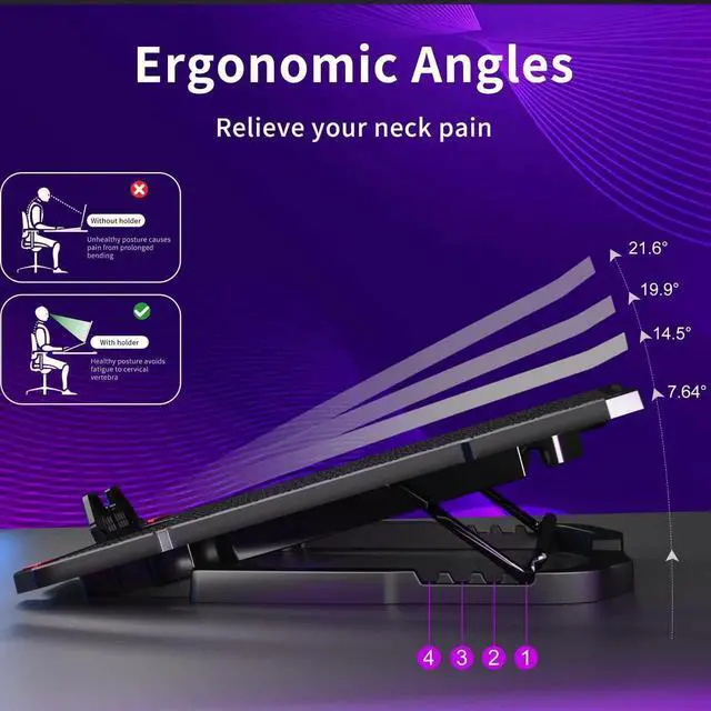 Introducing our new 5 Fans Laptop Cooling Pad, the ultimate solution for overheating laptops. With a total of five fans, including one large 120mm fan and four smaller 70mm fans, this laptop cooler provides maximum airflow to keep your laptop running cool and smooth. The metal mesh surface and hidden anti-slip pad provide a stable and secure platform for your laptop, while the four adjustable stands allow you to set the perfect angle for comfortable typing and viewing, raising your laptop to 2.5, 3.62, 4.33, 4.72 in, 7.64, 14.5, 19.1, 21.6 degrees.