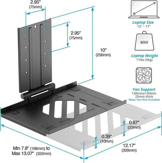 Wide Compatibility: Fits 12 to 17 in laptops; Tool-free extendable tray design accommodates various sizes; supports laptops with lids that open up to 120°.