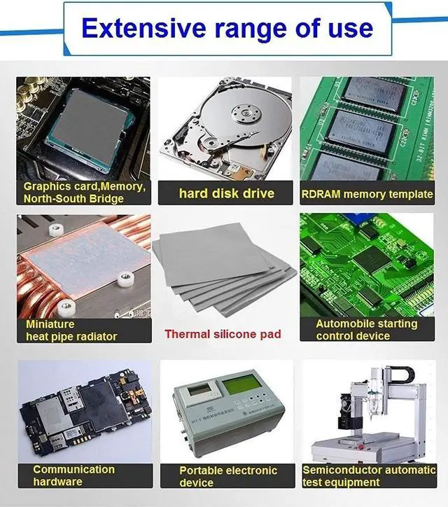 Application: Thermal Pad used in the control board of electronic and electrical products;Pads and foot pads inside and outside the motor; Appliances, automotive machinery, computer hosts, notebook computers, DVDs, VCDs, and any materials that require filling and cooling modules.