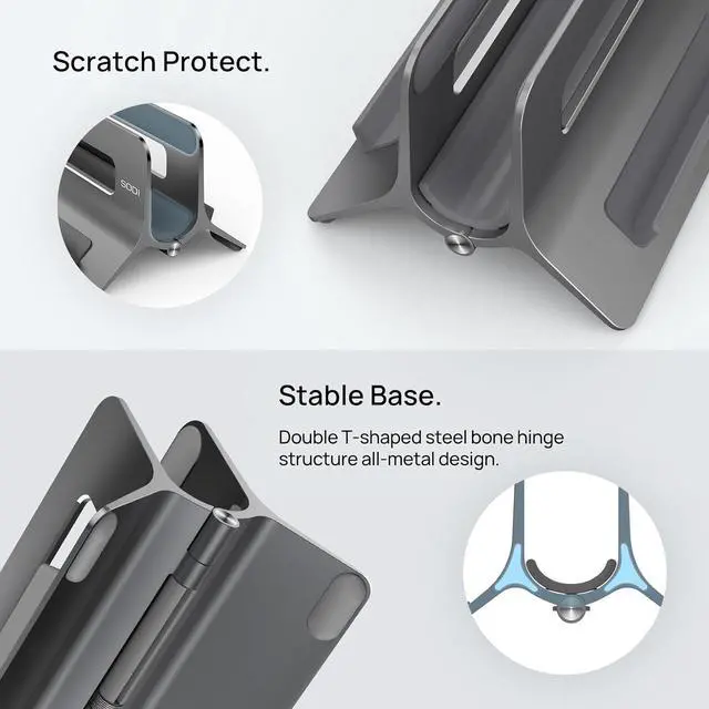 The vertical laptop stand can be adjusted to optimize heat dissipation and protect against dust. Durable & StableMade of premium aluminum alloy with sandblasted and CNC-machined finishes for a MacBook-like texture the laptop holder vertical is durable and stable. Featuring high-quality silicone pads that keep your laptop secure preventing from scratches and sliding. 3-in-1 Multi-Device FunctionalityThe space-saving office desk accessories can maximize your workspace efficiency by take laptops cell phones tablets books and kindles simultaneously in one sleek unit. The desktop organizer keeps your laptop straight improves heat dissipation to avoid overheating.