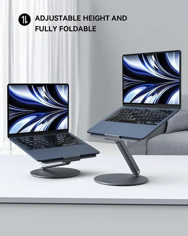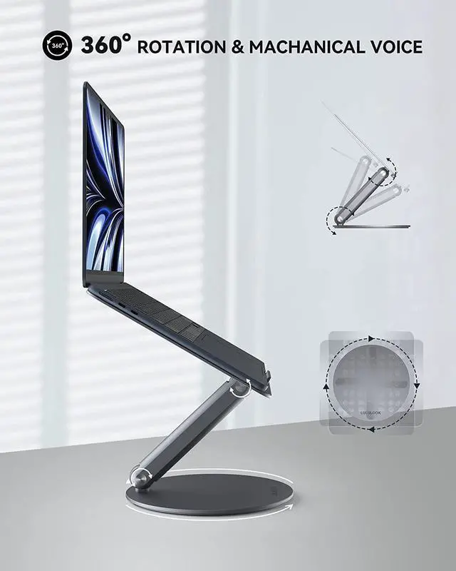 360° Rotation Base Laptop StandLULULOOK rotating laptop stand for desk allows you to easily share your screen with someone sitting across the room or at another desk. This is the perfect solution for anyone who works in an open office plan and wants to participate in meetings without leaving their workstation. It also works great for ideas sessions when collaborating with others over video chat or calls. Foldable & Height AdjustableThis desktop laptop stand was designed as an amazing adjustable computer pulpit stand that can easy be adjusted for zoom conferences and meetings watching a movie video gaming or can even be used for cooking as a cookbook stand.