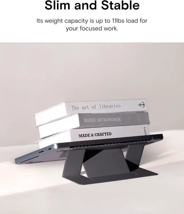 [Paper-Thin] MOFT laptop stand is only 0.1 in thin and weighs a mere 3 oz its small mearsurements makes it unfelt when carried and unsee when not in use. [Reliably Strong MacBook Stand] It's built with unique PU and fiber glass materials ensuring that it can hold a laptop stably with its small body. 11lbs is its weight bearing covering most macbook and laptops without vents. [One Piece Exclusive Structure] Our foldable laptop stand is one piece when it's not in use taking no extra space. It's a rock solid stand when it's folded up.