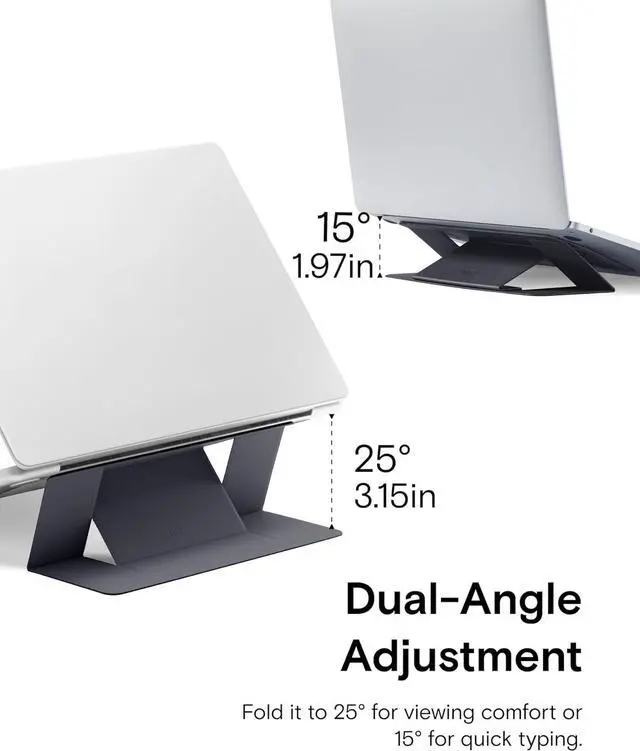 Transformation only takes one second. [Universal Compatibility] Laptop Stand is compatible with laptops without vents from 11''-16'' such as MacBook 13 inch MacBook Air 13 inch MacBook Pro 13 inch / 14 inch / 15 inch/ 16 inch (2023/2021/2020/ 2019/ 2018/ 2017). [Adjustable Golden Angles] It comes with two most needed angles 25° and 15°. The high-lifting mode raise a laptop 3in making users sit in a right posture. The low-lifting make the screen 2in higher to adopt to the standing situation.