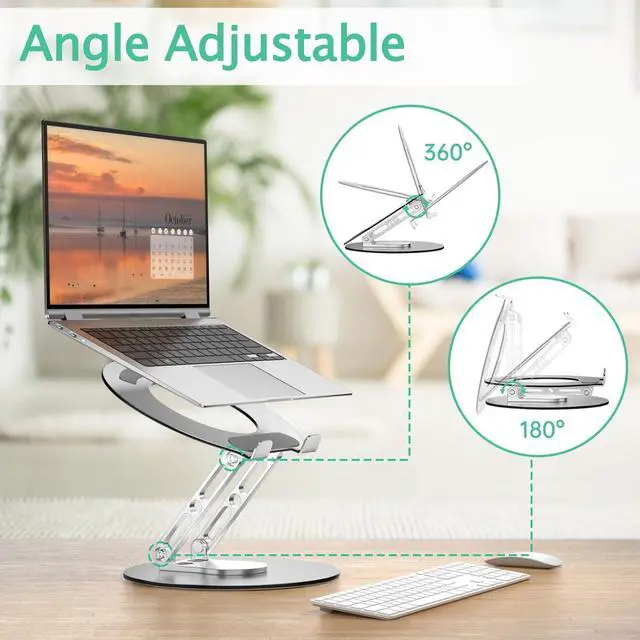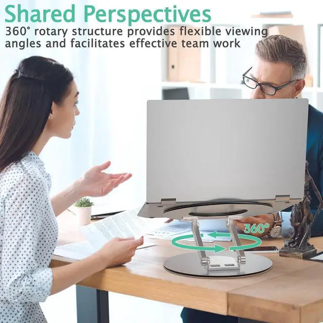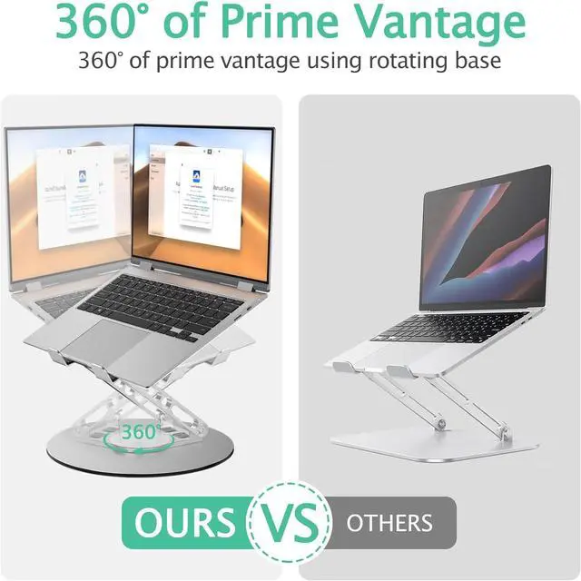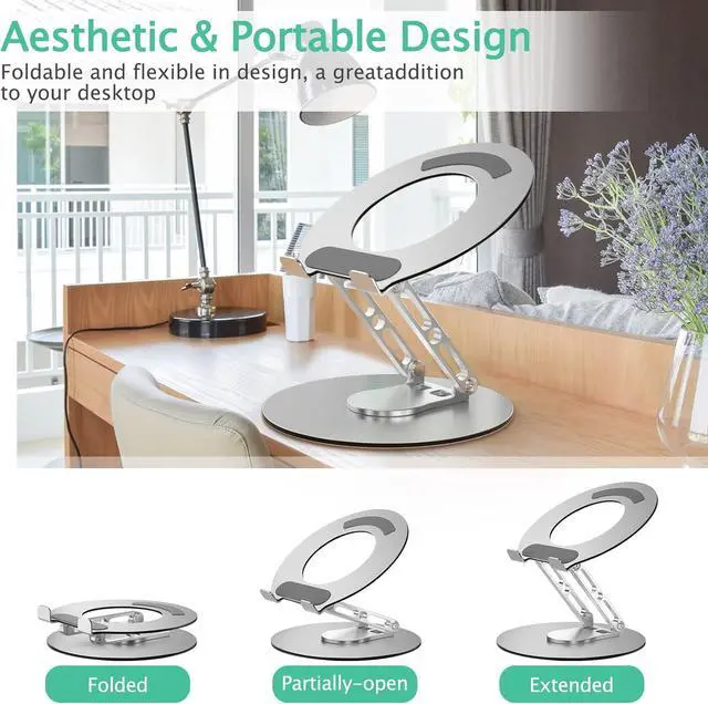 [360° Rotatable Laptop Stand] - Effortlessly rotate your laptop 360° with a smooth dual-axis base perfect for sharing screens presentations or adjusting to any angle. This unique feature enhances collaboration and transforms your workspace with unparalleled versatility. [Foldabe & Protable] - Foldable laptop stand for desk & Protable computer stand It combines the advantages of market brackets convenient travel laptop stand. Easy to use. Suitable for working at home office and outdoor improve comfort. [Ergonomic Design]You can freely adjust laptop stand height (up to 11.81 inches) and angle to a perfect eye level and helps to reduce shoulder and neck pain Which ensures you in a comfortable position.