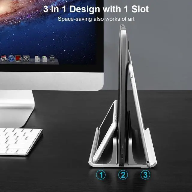 Premium Aluminum Construction - This laptop stand is made from high-quality anodized aluminum offering a scratch-resistant durable surface that withstands everyday wear and tear. The heavy base provides excellent stability ensuring your laptop or tablet stays securely in place. Silicone pads inside protect your devices from scratches while preventing slipping offering superior protection for all your tech. Versatile 3-in-1 Design - This stand is designed to hold a laptop tablet and phone simultaneously. Whether for work study or entertainment it helps keep your desk neat and organized boosting productivity. Its compatible with a variety of devices offering a perfect solution for a tidy and functional workspace.