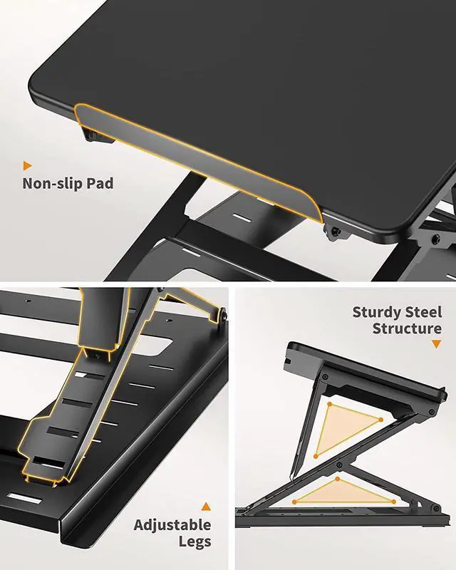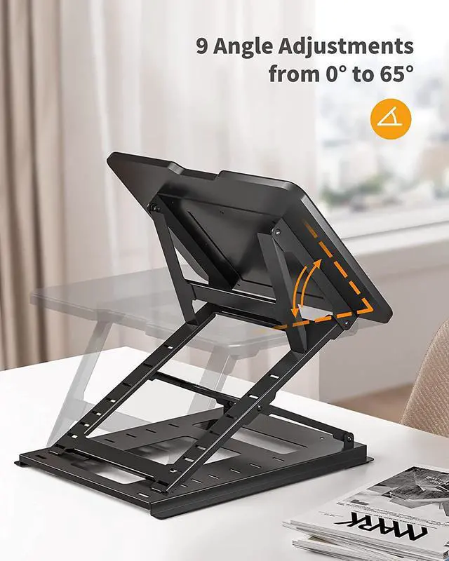 HEIGHT ADJUSTMENT - Our adjustable laptop stand can be freely adjusted from 3.5 to 16.5 inch in height allowing you to find a healthy balance between sitting and standing9 ERGONOMIC ADJUSTABLE ANGLES - With 9 adjustable angles this laptop desk stand provide different user experiences to maximize each customers needsSAFE