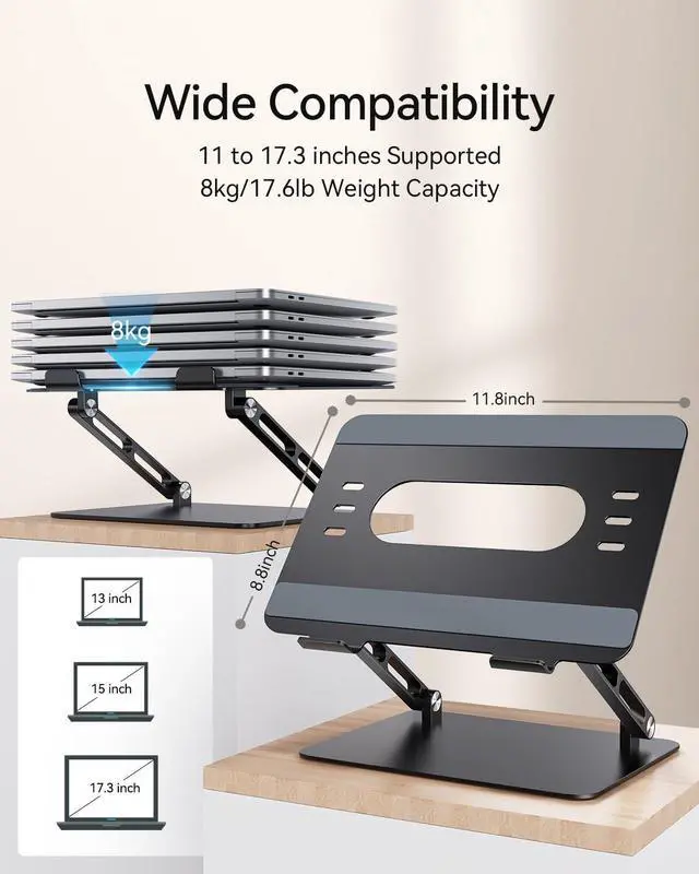 Adjustment Design. This laptop stand offers easy height and inclination adjustment to promote ergonomic positioning of your laptop at a perfect viewing angle reducing strain on your eyes wrists neck shoulder and back. Stable and Secure. This aluminum laptop stand is designed with a larger base and plate featuring an 8kg/18lb weight capacity. Anti-slip rubber grips and hooks prevent your laptop from sliding or slipping off. Universal Use. Compatible with devices ranging from 10 to 17.3 inches this computer riser works with a variety of laptops notebooks and tablets like MacBook HP LG iPad Pro and more.