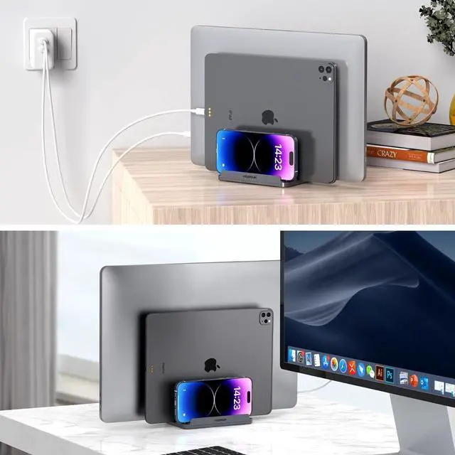Elegant and Functional: With a smooth glossy finish vertical holder not only serves as a practical solution for organizing your devices but also enhances the aesthetics of your desk.
