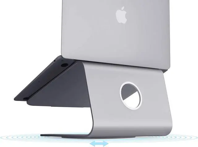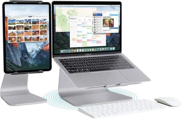 Better ergonomics is achieved with higher screen height. Tilt design brings screen closer and improves airflow around laptop. A super slim 360 degrees rotating base lets you share the screen and access ports easily. Single piece aluminum design provides solid stability. Keyboard stash clears up desk area when not in use.