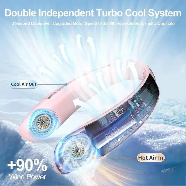 360° Surround Cooling: Dual turbine design provides even airflow to your face and neck, cooling you down in just 3 seconds.