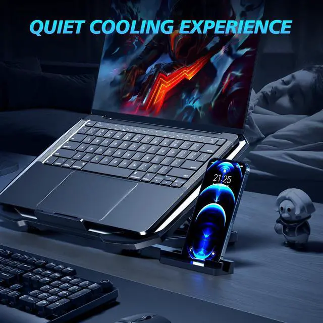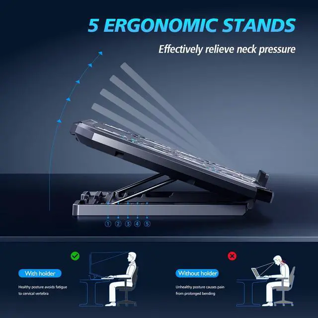 Ergonomic Stand & Anti-slip BaffleThis cooling pad for laptops features a 5-level height-adjustable stand to relieve neck pain from prolonged use and incorrect posture, along with a retractable non-slip baffle to prevent sliding.