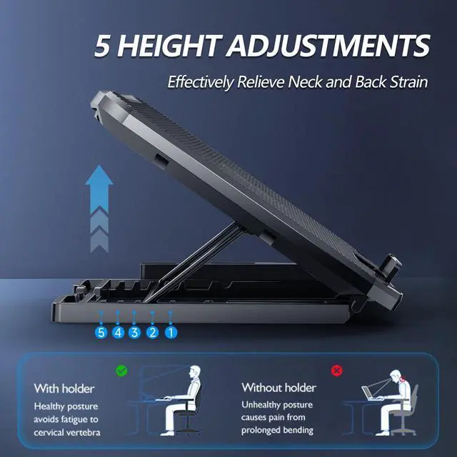 Ergonomic DesignEquipped with 5 adjustable height levels to relieve neck and back pain, this cooling pad for laptop also includes a retractable anti-slip baffle to prevent your laptop from sliding down on a slanted surface.