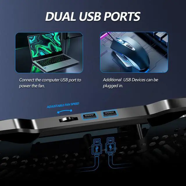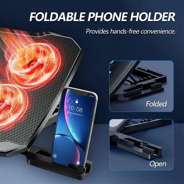 Dual USB Ports & Phone StandWith two USB ports on the back and a free USB cable, you can connect extra devices effortlessly. The cooling fan for laptop also includes a foldable phone holder, giving you a hands-free option for added convenience.
