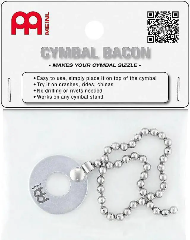 As the name implies, Meinl Cymbal Bacon is a stainless steel 10.5" long beaded chain that makes your cymbals sizzle. We had the minimalist in mind when making Cymbal Bacon because less is EXPONENTIALLY more when it comes to cymbal alterations-an area where at-home fabrications usually fall flat. It wasn't enough to make a solution to get that sound you've been hunting for. Meinl Cymbal Bacon had to be so incredibly sleek and easy to use that its user experience ranks as important as the end sound result. Adding a sizzle effect doesn't get much easier than this.Its sleek washer base is made to fit on any cymbal stand. Just place it over your cymbal and start playing. You can use Meinl Cymbal Bacon with or without cymbal felts and wing nuts. Try placing it on top of or underneath your felts to adjust the amount of sizzle. You can even place it on or remove during the middle of a song while playing if you just need it for one particular section. Meinl Cymbal Bacon is made for players who want a full sizzle sound but don't want to alter their cymbal by drilling for rivets. Its sound will have a big effect on your ride cymbal approach. Jazz drummers especially will find Cymbal Bacon to be a vital piece of gear.