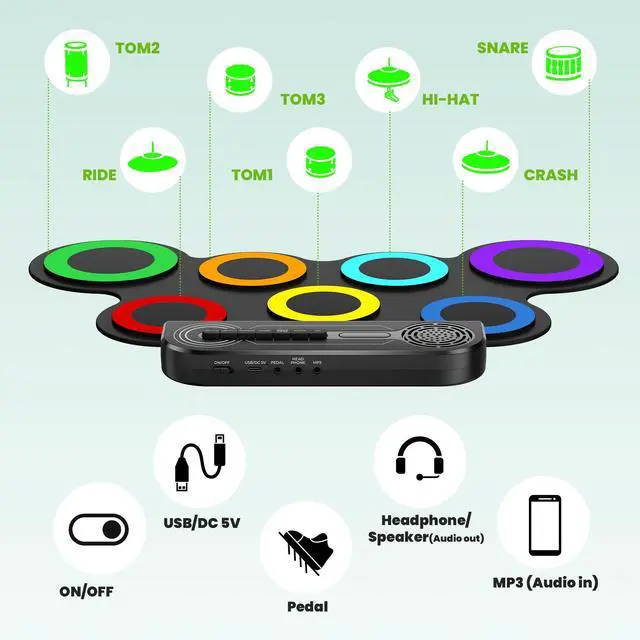 VerkTop Electric Drum Set Built-in Speaker, Kids Electronic Drum Practice Pad Kit, Portable Roll Up Drum Machine with 2 Foot Pedals, Drumsticks, Great Birthday Christmas Gifts for Girls Boys