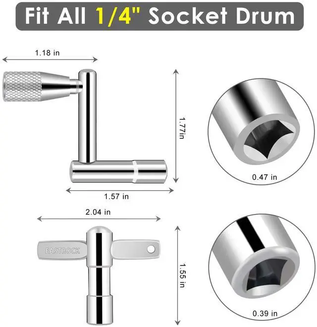 Our drum keys made of high quality chrome-plated steel, and are fit for all drums with standard 1/4" socket square tension rods whether electronic drum kit or traditional drum kit. This economical bundle includes 3 standard drum keys and 1 continuous motion speed drum key. The spinning camber design of the continuous motion key makes it ideal for quickly and easily removing and replacing drumheads.