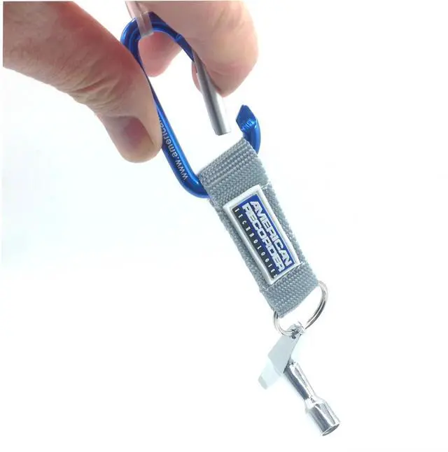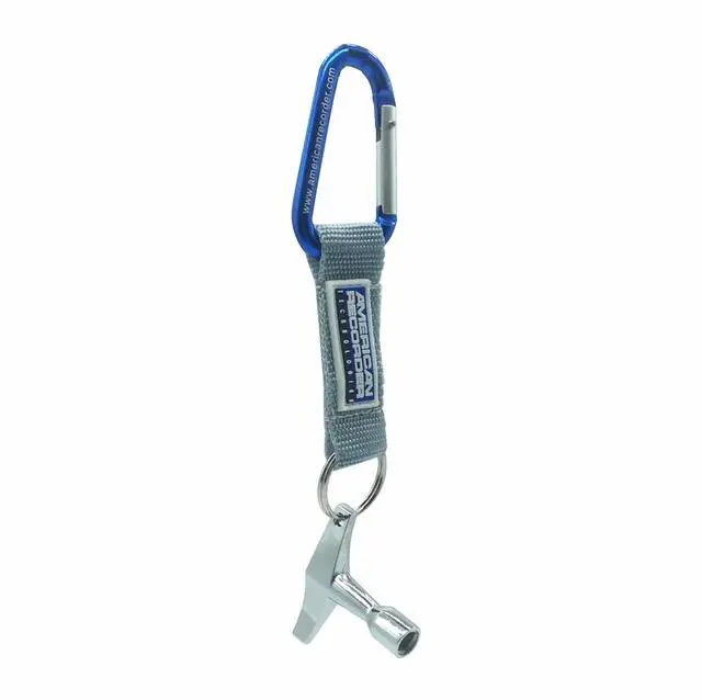 Stylish blue aluminum carabineer with drum key is ideal for clipping to belt loops, keeping drum key secure and ready to use at a moments notice. Add important keys and use as a key chain.