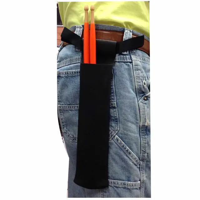Ideal drumstick holder with hook and loop T strapsfor attachmentto pant's belt loop, keeps your drumsticks right by your side. Great for marching band. Can hold up to two pair. Measures 13" x 3".