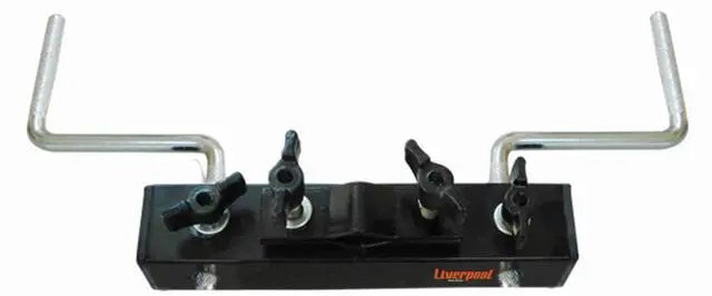 Rack has rigid base and adjustable to different sizes of pedestals with two curved extenders at the ends and two right in half, resulting in stability and strength in the professional use of supports for percussion. Screw down pole clamp attaches to all cymbal and microphone stands.