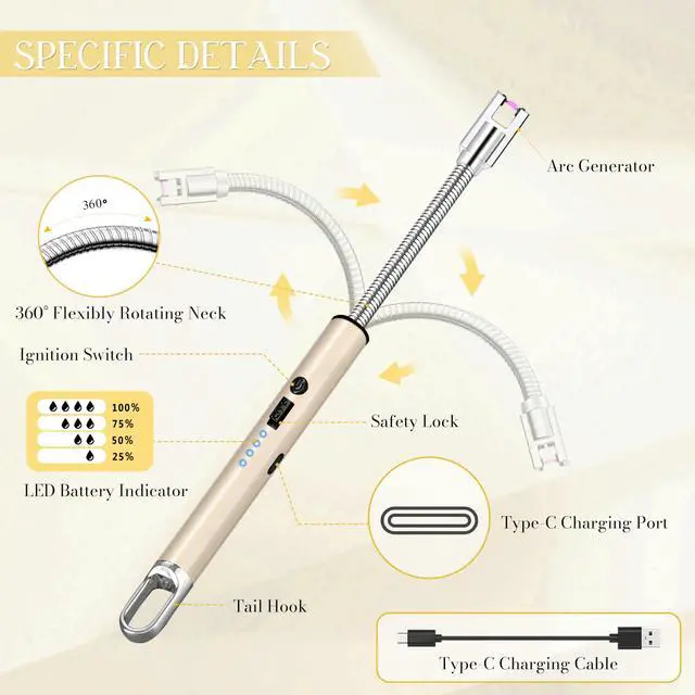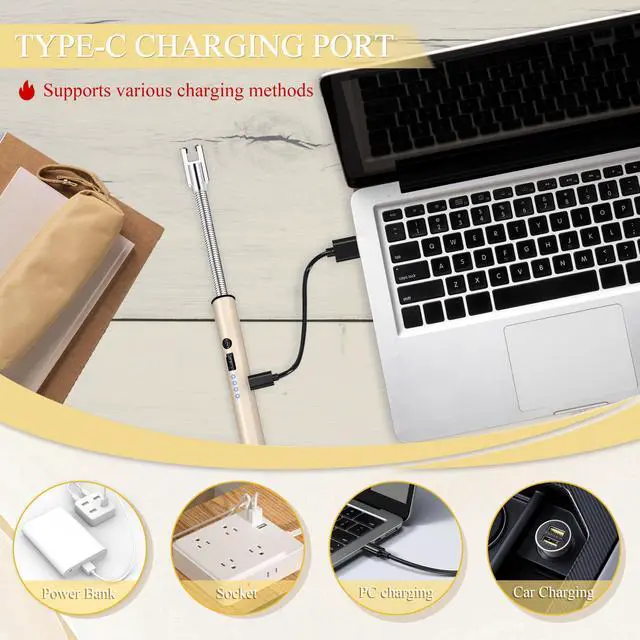 [HASSLE-FREE CHARGING, CLEAR DISPLAYS AT A GLANCE]- Electric candle lighter is equipped with clear power display function. When Four indicator lights on means full charge; one light on means it needs charging. When charging, the power indicator flashes from top to bottom. Each fully charge takes about 60 minutes. In addition, candle lighters adopts a Type-C interface and USB charging cable, help you easily deal with low power situations.