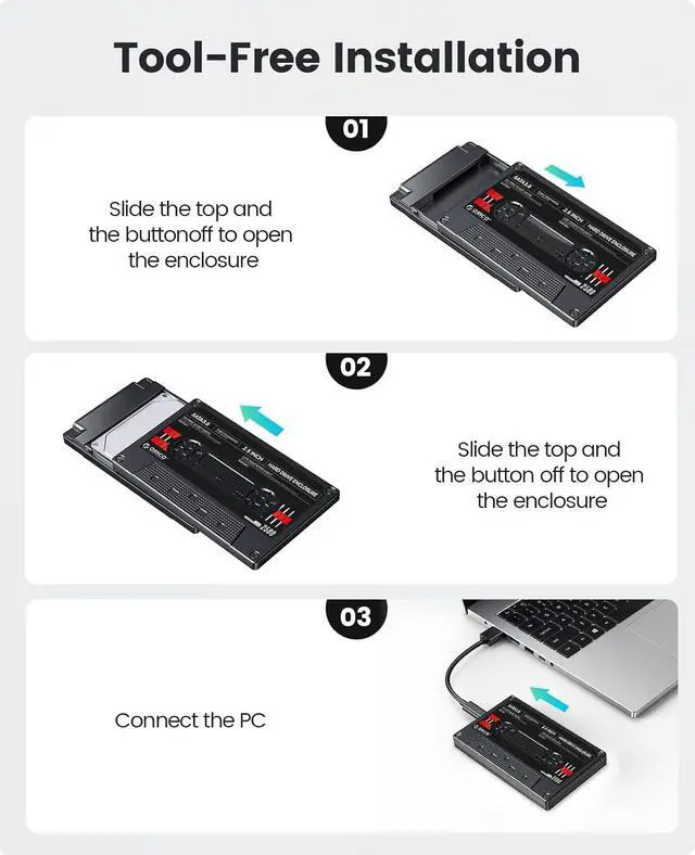3 senconds to install SSD/HDD in the sata external hard drice enclosure easily without using any tools and screws.