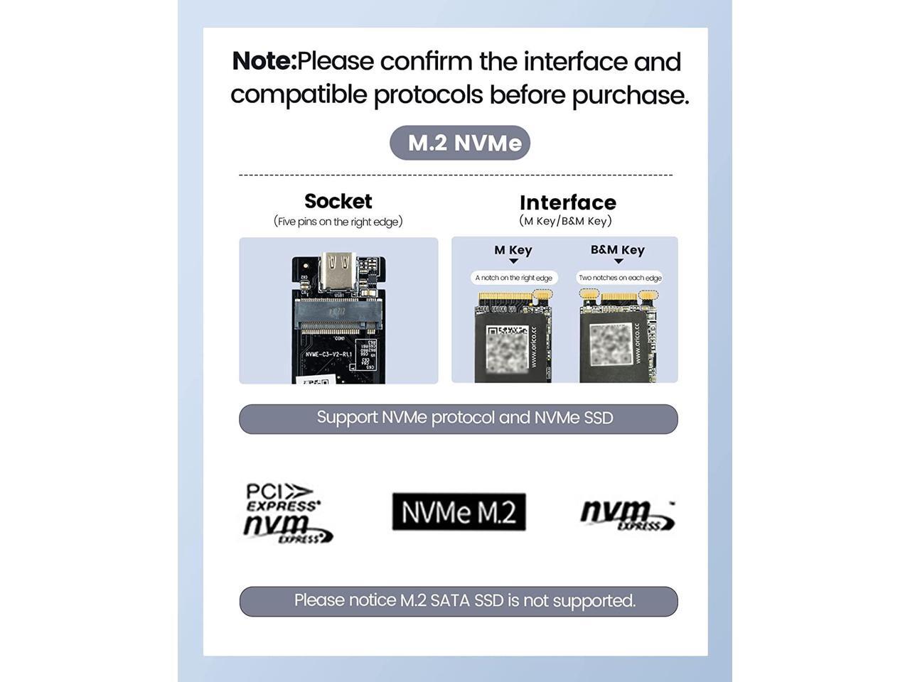 - Wide Compatibility:ORICO M207 M.2 enclosure compatible with M.2 PCIe NVMe M Key, NVMe B+M Key SSD in sizes 2230/2242/2260/2280. NOT Compatible with M.2 SATA SSDs, M.2 PCIe AHCI SSDs, M.2 PCIe devices.