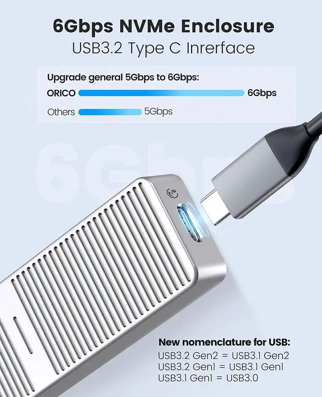 2SATAenclosure: the theoretical read and write speed can reach 480MB/s. Great for turning your internal SSD into a portable external ssd and storing data. Cooling Vest & Aluminum--The M. 2 adapter is professionally designed with the addition of an aluminum cooling vest, which wraps the SSD in all directions and conducts heat accurately. The M. 2 case is made of all-aluminum alloy material, and CNC technology is used to cut stripes to increase the heat dissipation area. Wide Compatibility--ORICO M. 2 enclosure compatible with both M. 2 PCIe NVMe M Key, NVMe B+M Key in sizes 2280. NOT Compatible with M. 2 SATA SSDs, M. 2 PCIe AHCI SSDs, M. 2 PCIe devices. Upgraded 2 in 1 Cable--The USB cable included with the M. 2 USB adapter has 2 output ports, USB C to A (10Gbps) and USB C to C (10Gbps).