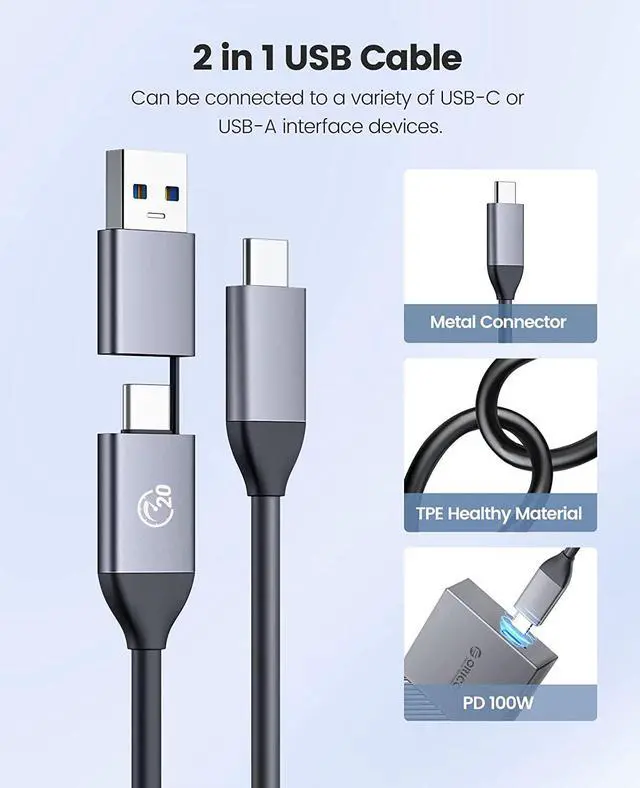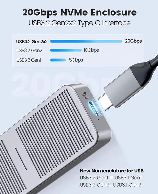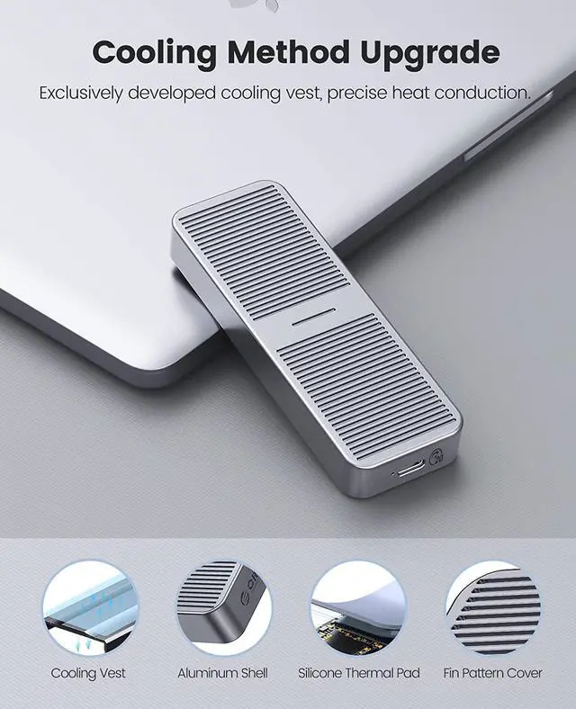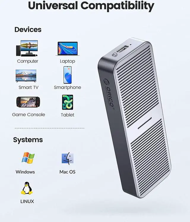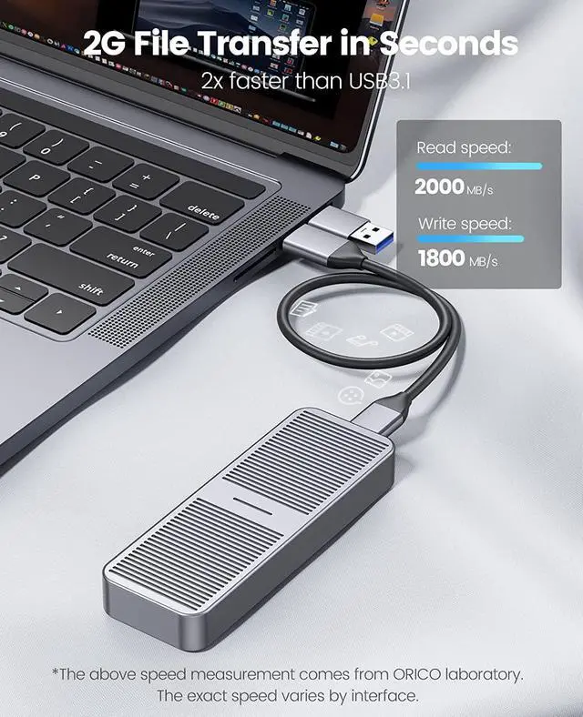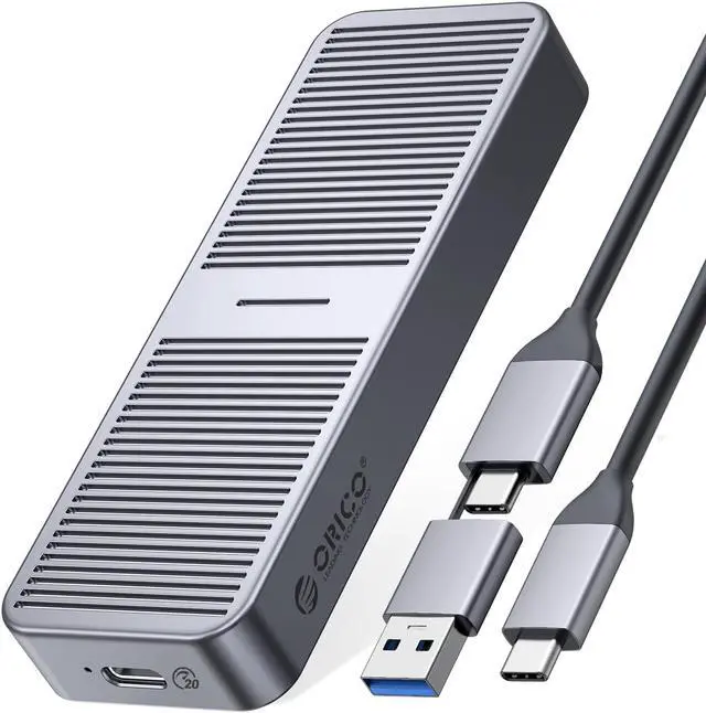 2SATAenclosure: the theoretical read and write speed can reach 480MB/s. Great for turning your internal SSD into a portable external ssd and storing data. Cooling Vest & Aluminum--The M. 2 adapter is professionally designed with the addition of an aluminum cooling vest, which wraps the SSD in all directions and conducts heat accurately. The M. 2 case is made of all-aluminum alloy material, and CNC technology is used to cut stripes to increase the heat dissipation area. Wide Compatibility--ORICO M. 2 enclosure compatible with both M. 2 PCIe NVMe M Key, NVMe B+M Key in sizes 2280. NOT Compatible with M. 2 SATA SSDs, M. 2 PCIe AHCI SSDs, M. 2 PCIe devices. Upgraded 2 in 1 Cable--The USB cable included with the M. 2 USB adapter has 2 output ports, USB C to A (10Gbps) and USB C to C (10Gbps).