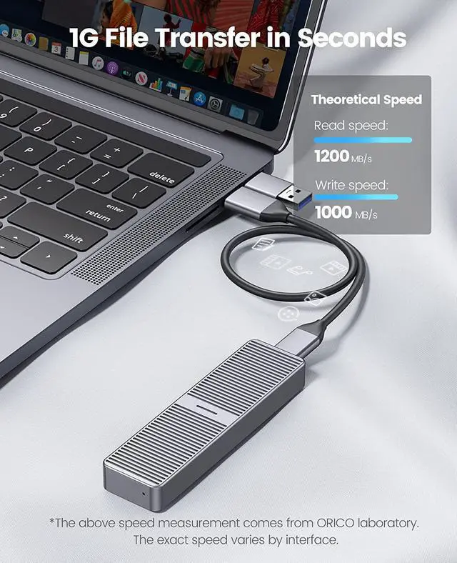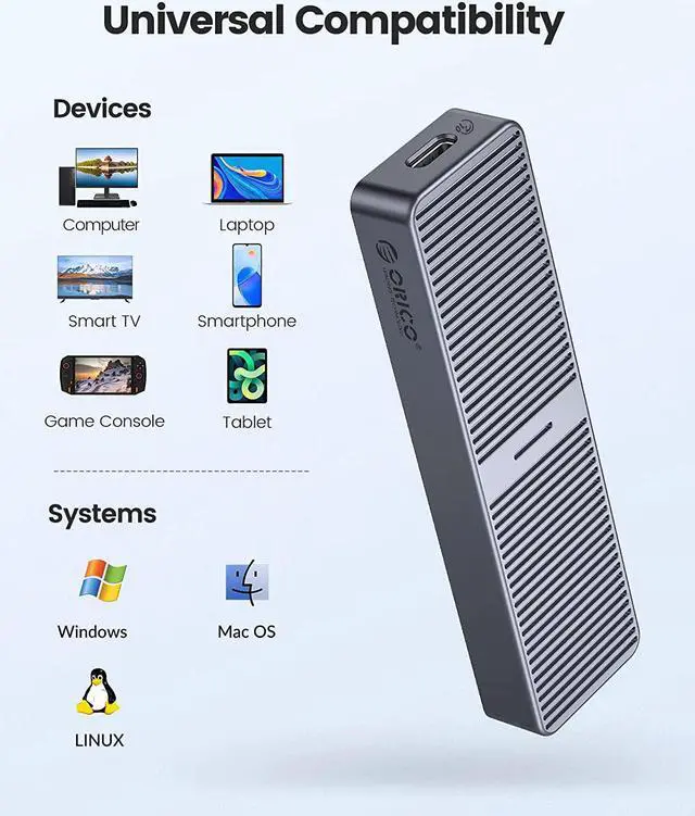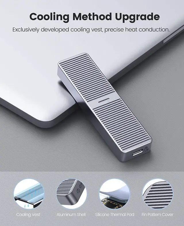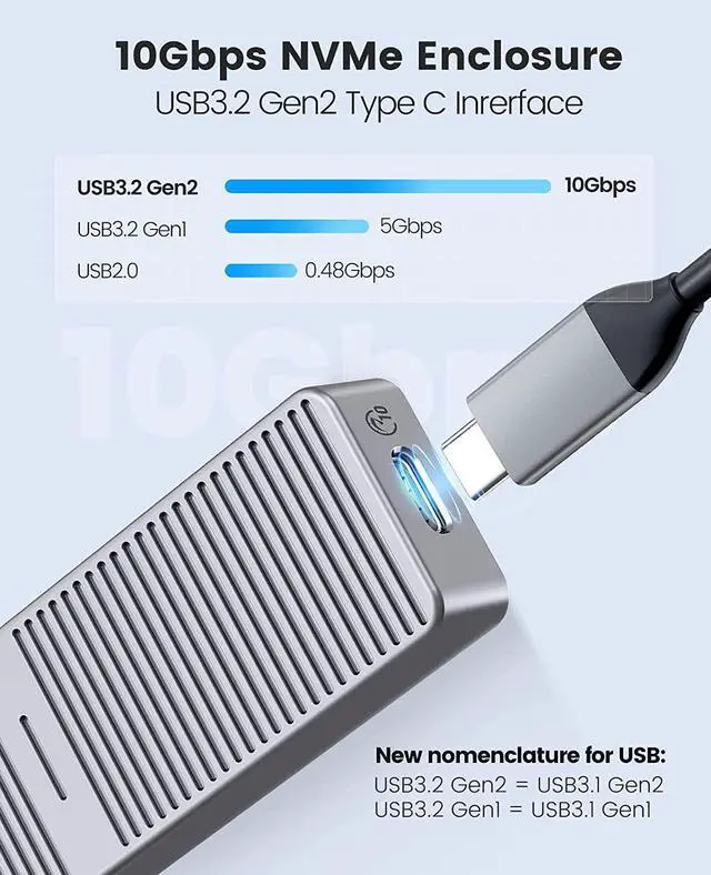2SATAenclosure: the theoretical read and write speed can reach 480MB/s. Great for turning your internal SSD into a portable external ssd and storing data. Cooling Vest & Aluminum--The M. 2 adapter is professionally designed with the addition of an aluminum cooling vest, which wraps the SSD in all directions and conducts heat accurately. The M. 2 case is made of all-aluminum alloy material, and CNC technology is used to cut stripes to increase the heat dissipation area. Wide Compatibility--ORICO M. 2 enclosure compatible with both M. 2 PCIe NVMe M Key, NVMe B+M Key in sizes 2280. NOT Compatible with M. 2 SATA SSDs, M. 2 PCIe AHCI SSDs, M. 2 PCIe devices. Upgraded 2 in 1 Cable--The USB cable included with the M. 2 USB adapter has 2 output ports, USB C to A (10Gbps) and USB C to C (10Gbps).