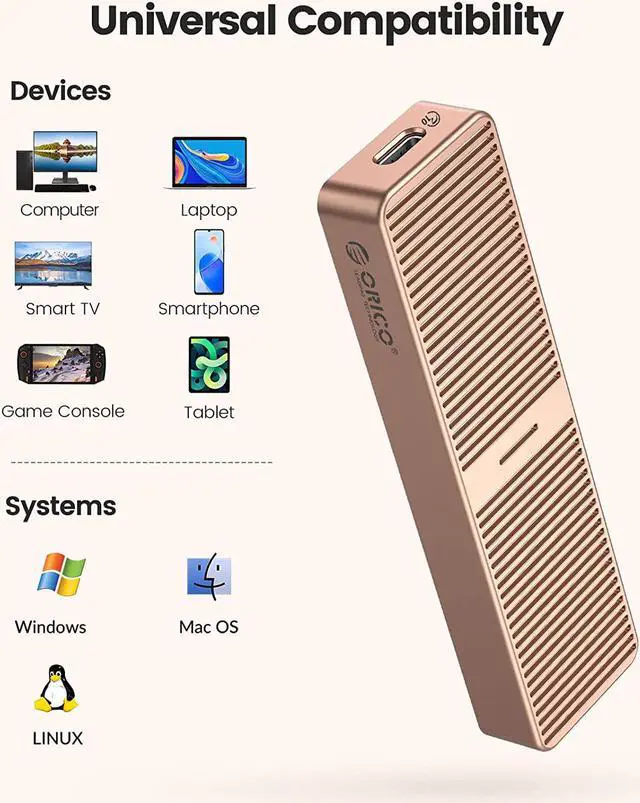 • Wide Compatibility--ORICO M.2 enclosure compatible with both M.2 NVMe and SATA SSDs in sizes 2280.