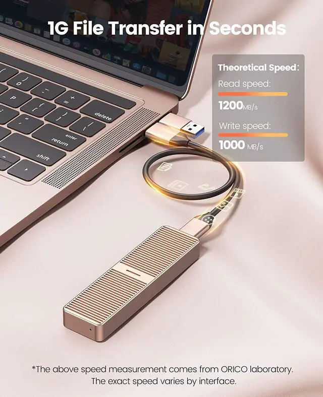 2SATAenclosure: the theoretical read and write speed can reach 480MB/s. Great for turning your internal SSD into a portable external ssd and storing data. Cooling Vest & Aluminum--The M. 2 adapter is professionally designed with the addition of an aluminum cooling vest, which wraps the SSD in all directions and conducts heat accurately. The M. 2 case is made of all-aluminum alloy material, and CNC technology is used to cut stripes to increase the heat dissipation area. Wide Compatibility--ORICO M. 2 enclosure compatible with both M. 2 PCIe NVMe M Key, NVMe B+M Key in sizes 2280. NOT Compatible with M. 2 SATA SSDs, M. 2 PCIe AHCI SSDs, M. 2 PCIe devices. Upgraded 2 in 1 Cable--The USB cable included with the M. 2 USB adapter has 2 output ports, USB C to A (10Gbps) and USB C to C (10Gbps).