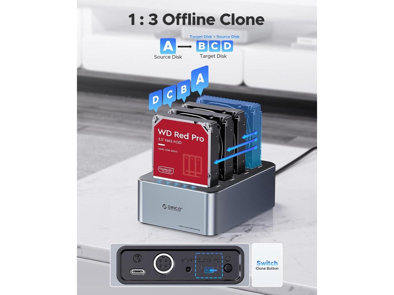 - 1:3 Offline Hard Drive DuplicatorORICO 4-bay hard drive docking station supports duplicating three copies simultaneously via one button without connecting to a computer. Backup before cloning or the target disk will be overwritten. (LED indicator monitors the working status).